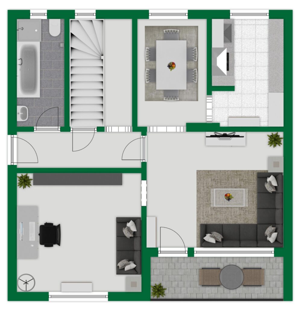 Im Erdgeschoss erwartet Sie eine offene und gemütliche Raumaufteilung. Die Küche ist durch einen rustikalen Türbogen aus Backsteinen vom angrenzenden Esszimmer getrennt ist. Der charmante Backstein-Stil setzt sich an einer Wand des Esszimmers fort und verleiht dem Raum eine warme und behagliche Atmosphäre. Vom Esszimmer aus gelangen Sie durch einen weiteren offenen Bogen in das helle, großzügige Wohnzimmer. Hier haben Sie Zugang zu einem Balkon, der einen schönen Blick auf den Garten bietet und viel Tageslicht hereinlässt. Zusätzlich gibt es auf dieser Ebene ein weiß gefliestes Badezimmer sowie ein weiteres Zimmer, das flexibel als Schlafzimmer, Arbeitszimmer oder Gästezimmer genutzt werden kann.