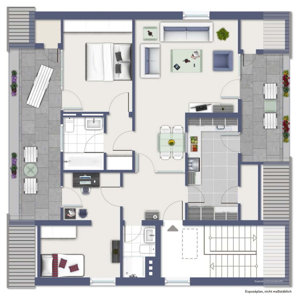 Der durchdachte Grundriss bietet zwei komfortable Schlafzimmer sowie ein großzügiges Wohnzimmer, das dank der kaum vorhandenen Dachschrägen ein besonders offenes und luftiges Raumgefühl vermittelt, ein echter Mehrwert für eine Dachgeschosslage. Die separate, geräumige Küche bietet ausreichend Platz für eine moderne Einbauküche sowie einen Essbereich und verfügt zusätzlich über praktische Abstellmöglichkeiten, die den Alltag deutlich erleichtern und für Ordnung sorgen. Vorhanden sind außerdem ein großes Badezimmer mit Tageslicht und ein separates Gäste-WC mit integrierter Dusche, welches zusätzlichen Komfort für Besucher oder Familienmitglieder bietet.