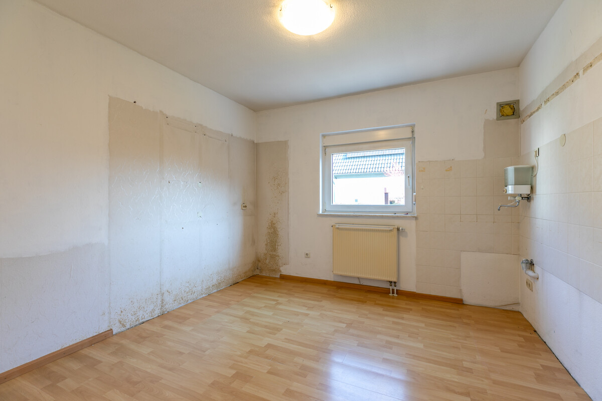 Das Erdgeschoss bietet eine praktische und gut nutzbare Raumaufteilung mit zwei Zimmern, einer Küche und einem modernisierten Duschbad. Bei der Neugestaltung der Küche wäre hier die Zusammenlegung des daneben gelegenen Raumes denkbar, da es sich hier nicht um eine tragende Wand handelt. Insgesamt überzeugt das Erdgeschoss durch seine klare Struktur und eröffnet zahlreiche Möglichkeiten zur Umgestaltung und Modernisierung.