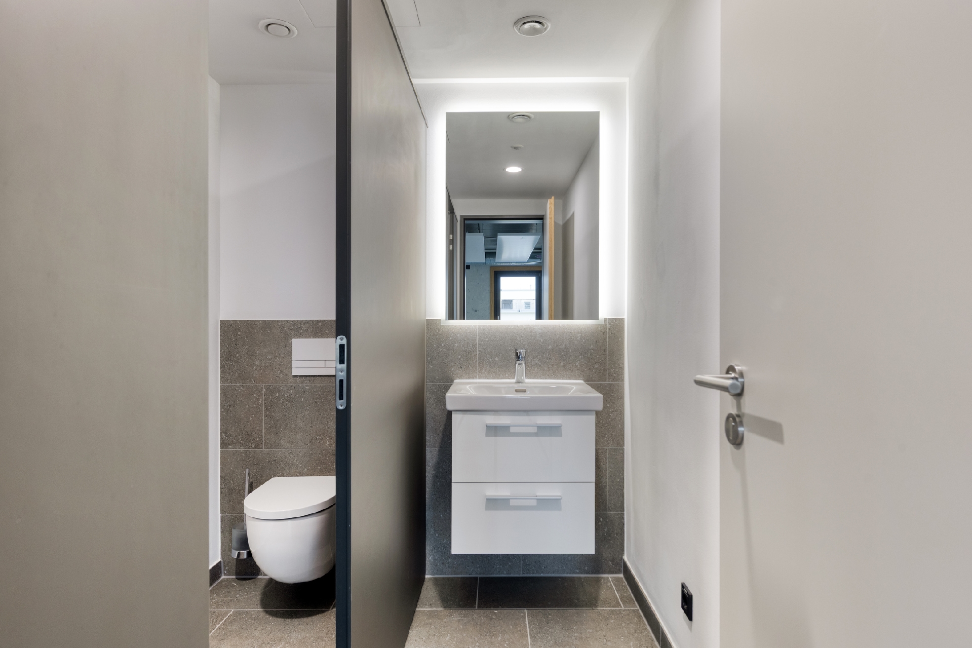 Barrierefreie WCs auf jeder Etage sowie getrennte Sanitäranlagen für Damen und Herren gewährleisten Komfort und uneingeschränkte Zugänglichkeit für Mitarbeiter und Besucher gleichermaßen ein weiterer Pluspunkt der modernen und inklusiven Gebäudekonzeption.