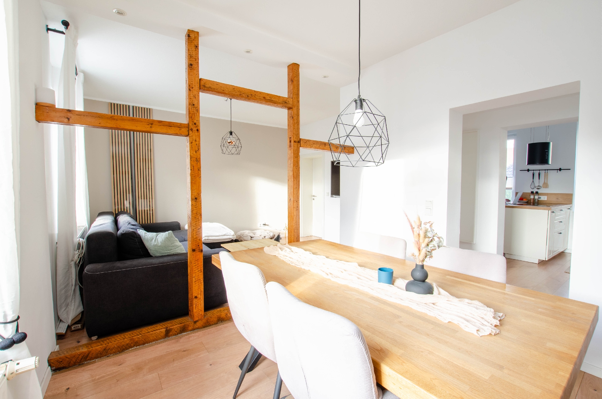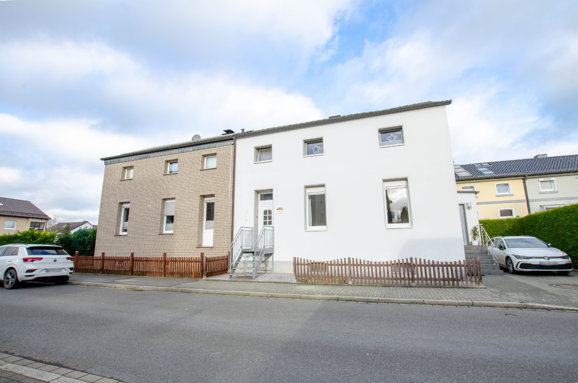Rechts des Doppelhauses befinden sich zwei separate, moderne Wohnungen, die jeweils mit einem lichtdurchfluteten Wohn- und einem gemütlichen Schlafzimmer ausgestattet sind. Diese Einheiten sind perfekt für Paare, Singles oder als Gästeunterkünfte. Die moderne Gestaltung und die hellen Farben schaffen ein einladendes Ambiente, das zum Entspannen einlädt. Jedes Detail wurde sorgfältig ausgewählt, um Funktionalität und Stil zu vereinen.