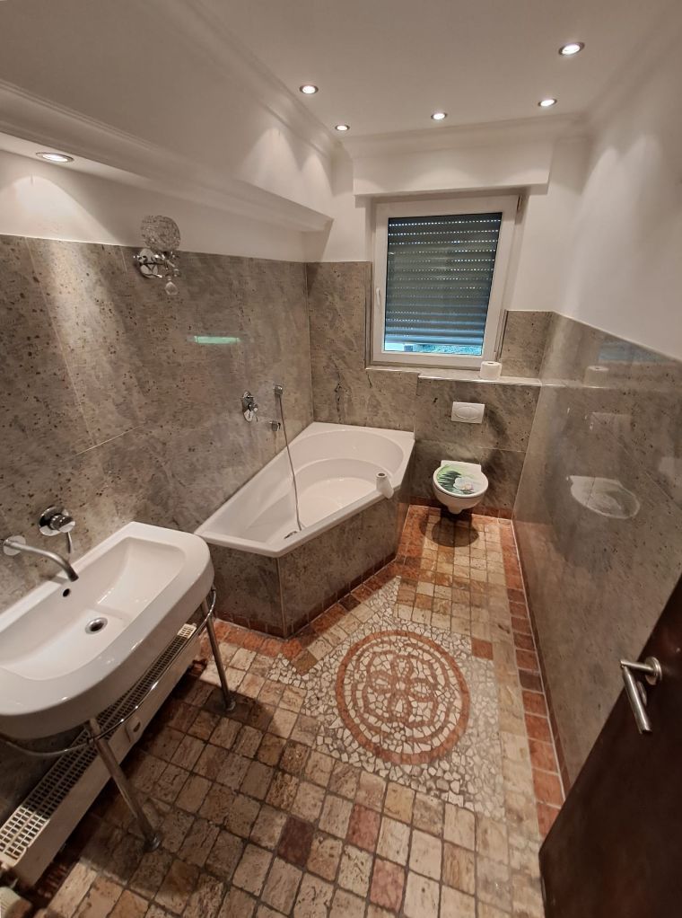 Helle Wohnungen, teilweise Parkett und Fliesenfußbodenoberbelag, Granit, Eckbadewanne, Handtuchheizkörper, Küche mit Terrassenausgang, Bäder mit Tageslicht, Kuntstofffenster mit Isolierverglasung, Gasheizung.